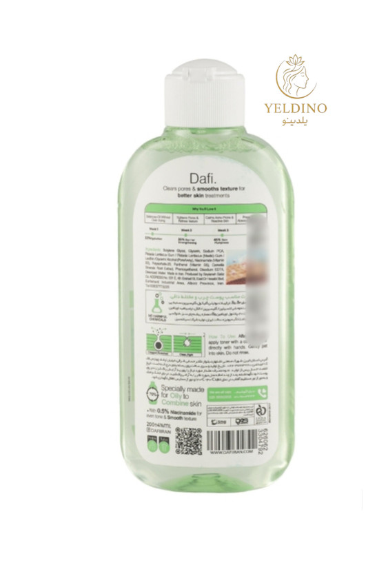 تونر دافی فرموله شده برای پوست چرب و مختلط کمک به کنترل چربی، ترشح سبوم و PH پوست حاوی نیاسینامید جهت کوچک کردن منافذ و جلوگیری از ایجاد جوش های سر سیاه و سر سفید جلوگیری از ایجاد خشکی و کشیدگی پوست به دلیل وجود گلیسیرین دارای خواص ضد التهابی جهت تسکین سوزش، قرمزی و التهابات پوستی